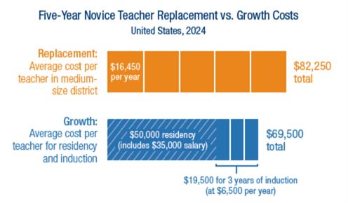 Based on average national replacement costs and residency costs, SREB has calculated a $12,750 average savings of over five years for medium-sized districts by growing and supporting novice teachers rather than replacing the novice teachers that leave annually.