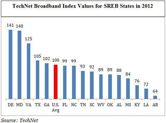 In 2012, 10 SREB states ranked below the national average on a broadband index developed by TechNet, a public policy group of leaders in the technology industry. TechNet’s analysis considers the pervasiveness of broadband access and fiber-optic infrastructure; typical network speeds throughout the state; and the number of people employed in information technology, communication technology and mobile applications development. This survey helps states assess their bandwidth adequacy within a range of technology contexts, including education and homes.