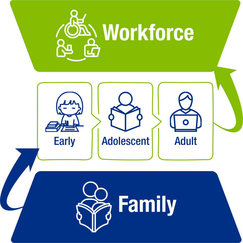 Literacy is a continuous journey from early childhood to adulthood, supported by family and crucial for the workforce. Distinct developmental stages build on one another across the lifespan to shape personal and professional success.